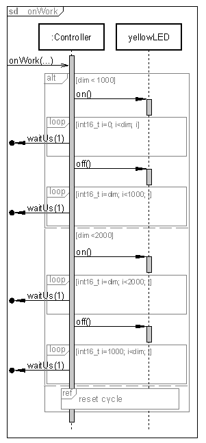 // continuous event from the Mainloop static uint16_t dim=0; dim++; if (dim < 1000) { yellowLED.on(); for (int16_t i=0; i<dim; i++) waitUs(1); yellowLED.off(); for (int16_t i=dim; i<1000; i++) waitUs(1); } else if(dim <2000) { yellowLED.on(); for (int16_t i=dim; i<2000; i++) waitUs(1); yellowLED.off(); for (int16_t i=1000; i<dim; i++) waitUs(1); } else { dim=0; }