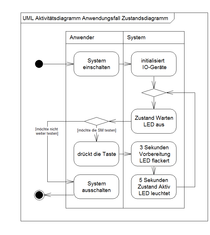 Bei den Basiskonzepten haben Sie gelernt, dass Objekte Zustände besitzen. Das UML-Zustandsdiagramm ist ein Ausdrucksmittel, welches immer dann angewendet werden sollte, wenn im Mittelpunkt der Betrachtung ein komplexes zustandsorientiertes Problem steht. Des Weiteren ist die softwareseitige Implementation einer Zustandsmaschine nicht trivial. SiSy ist in der Lage, aus dem UML-Zustandsdiagramm den entsprechenden Quellcode zu generieren. Die automatisch generierte Zustandsmaschine verringert den Aufwand und reduziert die Fehleranfälligkeit gegenüber einer manuellen Implementation enorm. Zustandsmaschinen sind oft zyklisch und laufen, solange ein Objekt existiert. Die Zustandsänderungen sind in der Regel an Ereignisse und Bedingungen geknüpft. Das Zustandsdiagramm zeigt nur Zustände und Zustandswechsel eines Objektes, jedoch keine objektübergreifenden Sachverhalte. Ein Objekt kann aber durchaus mehrere Zustandsmaschinen gleichzeitig, also parallel, besitzen.