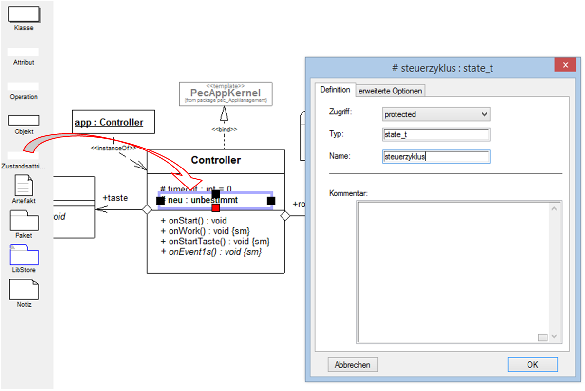Jetzt kann es los gehen. In der Klasse Controller haben wir das Attribut #steuerzyklus:state_t angelegt. Auf diesem können Sie im Kontextmenü nach unten wählen und gelangen zum Zustandsdiagramm. Laden Sie folgende Vorlage aus dem LibStore.