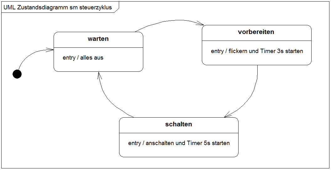 Das konkrete, den Zuständen zuzuordnende Verhalten notieren wir in den Zustandsaktionen. Für die Aufgabenstellung reichen uns die Entry-Aktionen der Zustände. Ergänzen Sie diese wie folgt: