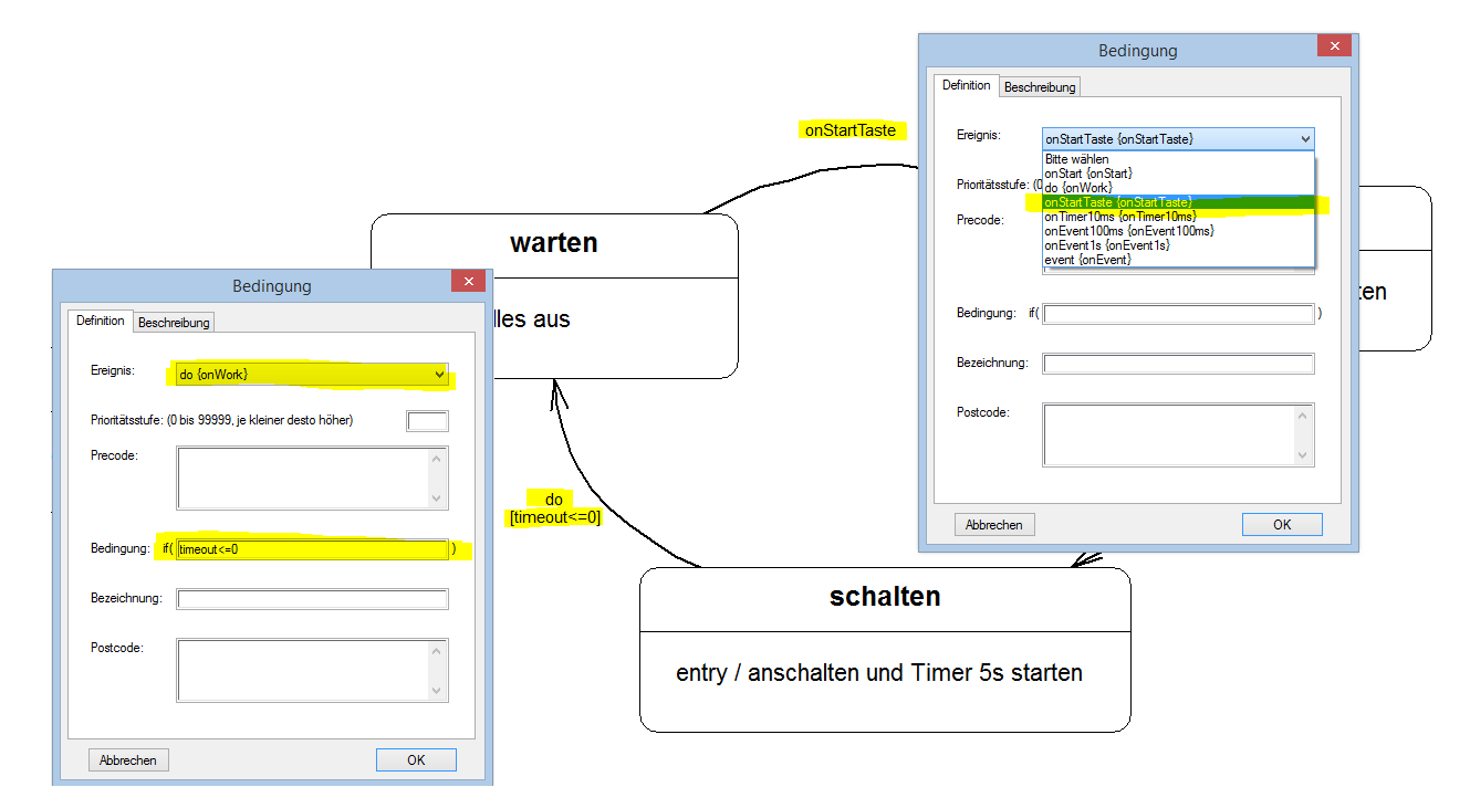 Der nächste Schritt betrifft die Zustandsübergänge. Diese müssen vom Programmierer explizit einem Ereignis zugewiesen werden. In der zugewiesenen Operation (Eventhandler) wird durch den Codegenerator der Code für den Zustandsübergang erzeugt. Dieser kann mit einer zusätzlichen Bedingung (Guard) und beim Übergang zusätzlich auszuführenden, benutzerspezifischem Code ergänzt werden. Weisen Sie die entsprechenden Ereignisse und Übergangsbedingungen den Zustandsübergängen zu.