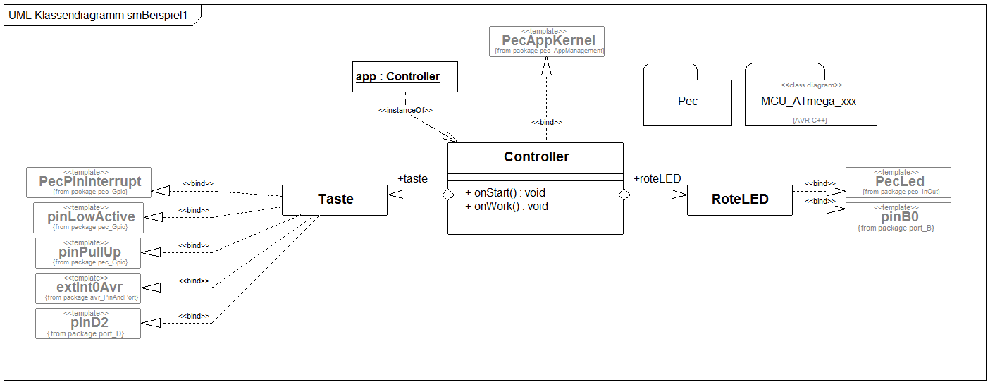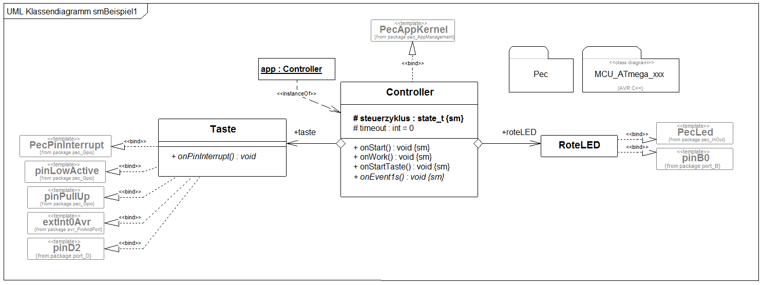 Wir bereiten die Struktur des Systems vor. Das System benötigt als Mensch-Maschine-Schnittstelle eine Taste und eine LED. Die Taste schließen wir an Port D Bit 2 an und die LED an Port B Bit 0. Als Basis-Templates nutzen wir PecPinInterrupt und PecLed. Achten sie auf die korrekte Konfiguration des Interrupts Pins (LowAktiv, PullUp, INT0, fallende Flanke).