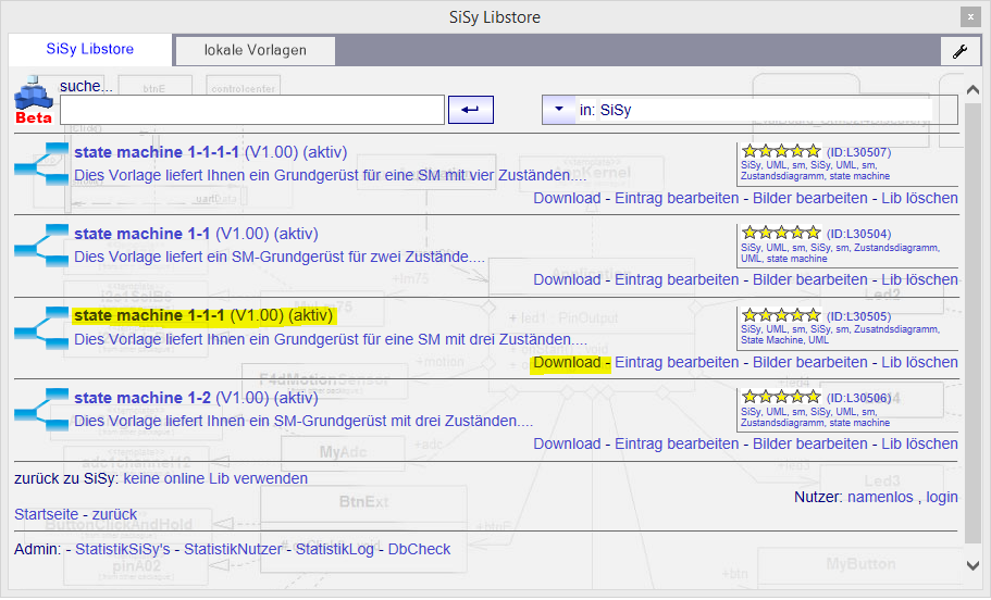 Die Modellierung von Zustandsdiagrammen wird in unserem Lehrbuch Software Engineering für Embedded Systems näher beschrieben. SiSy ist in der Lage, aus solchen Zustandsdiagrammen den kompletten Quellcode, der die Zustandsmaschine realisiert, zu generieren und in die zugehörige Klasse einzubetten.