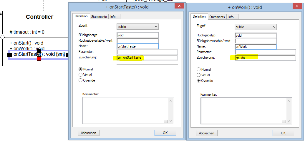 Der Zustandsautomat soll im Controller laufen. Da die zustandsorientierte Programmierung auch immer Ereignisorientiert ist sorgen wir zunächst in der Klasse Controller für die benötigten Ereignishandler und deren Sichtbarkeit im Zustandsdiagramm. Das kontinuierliche Ereignis onWork soll im Zustandsmodell als do erscheinen. Für den Tastendruck legen wir einen Ereignishandler mit dem Namen onStartTaste an. Das Sichtbarmachen im Zustandsdiagramm erfolgt mit der Zusicherung sm::eventName. Später wird der Codegenerator in diese Operationen die nötigen Codes für die funktionsfähige Zustandsmaschine generieren.