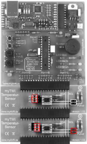 Als nächster Schritt soll ein weiterer Temperatursensor an den Bus angeschlossen werden. Dazu ist es nötig, diesem eine andere Adresse zuzuweisen. Beachten Sie auch, dass möglichst nur einmal die PullUp-Widerstände zugeschaltet sind.