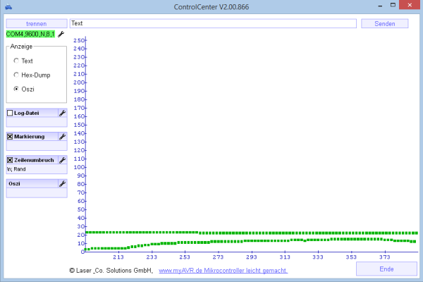 Zur Visualisierung sollte die Oszi-Ansicht des Controlcenters auf Punkte umgestellt werden. Tipp: Damit der zweite Sensor auch eine deutlich andere Temperatur hat, kann man diesen im Kühlschrank abkühlen