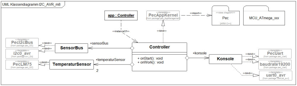 Bei Verwendung der I²C-Klassen wird in der PEC automatisch ein I²C-Bus instanziiert. Da es beim AVR auch immer nur einen TWI Baustein gibt, braucht sich der Anwendungsentwickler um nichts weiter zu kümmern, als sich eine Instanz der gewünschten Klasse zu erzeugen und diese zu benutzen.