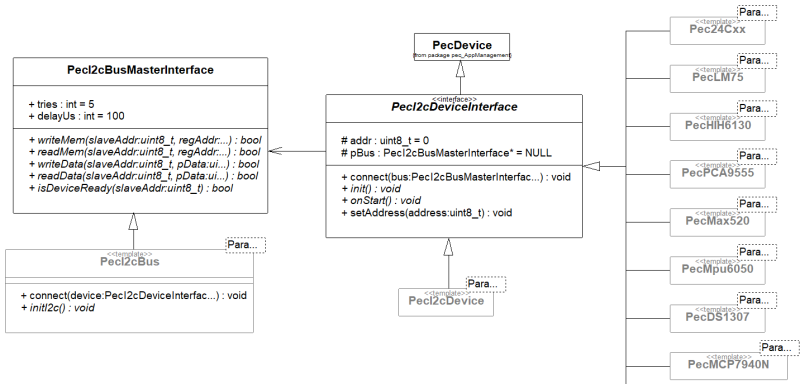 Das PEC-Framework stellt für den I²C-Bus zunächst abstrakte Interfaces bereit. Diese unterscheiden den I²C-Bus und das I²C-Device. Der Bus repräsentiert den Master und wird als Low Level Treiber für den oder die I²C Bausteine im verwendeten Mikrocontroller in den spezifischen Bibliotheken realisiert.