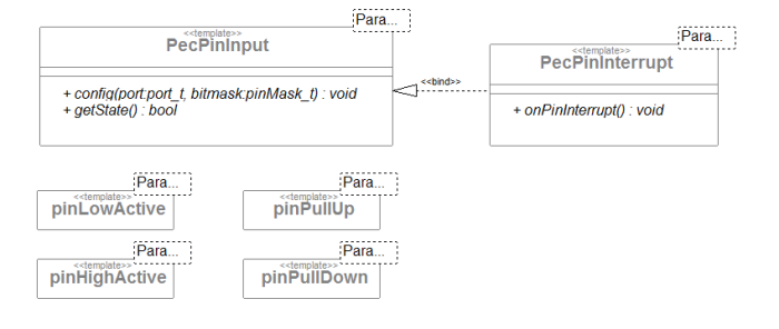Aus diesem Modellabschnitt lässt sich ablesen, dass für einen externen Interrupt das Template PecPinInterrupt zur Verfügung steht. Dabei „erbt“ dieses Template alle Eigenschaften des PecPinInput. Das bedeutet, dass für PecPinInterrupt alle Optionen und Parameter des PecPinInput möglich sind. Zusätzlich muss der konkrete Interrupt des verwendeten Pins konfiguriert werden. Das Interruptereignis wird durch Überschreiben der Operation +onPinInterrupt():void behandelt.