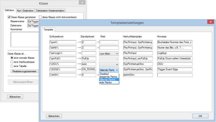 Sie können statt weiterer Templates wie pinPullUp oder pinLowActiv die gewünschten Eigenschaften und Parameter auch im Dialogbetrieb einstellen. Dazu selektieren Sie die Klasse ExtTrigger und rufen den Definierendialog auf. Dort erreichen Sie über die Schaltfläche Realisierungsparameter die gewünschten Einstellungen.