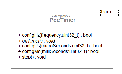 Timer sind vielleicht die essentiellsten Bausteine in eingebetteten Systemen. So ziemlich jede eingebettete Lösung bildet in der einen oder anderen Form ein möglichst determiniertes Zeitverhalten ab. Die beste Art Zeitereignisse zu erzeugen ist es eine Hardware damit zu beauftragen. Timer sind dem Wesen nach Zähle. Sie zählen einfachsten Fall Systemtakte. Wenn es langsamer gehen soll werden Vorteiler verwendet. Typische Zeitereignisse werden aus dem Erreichen der Null bzw. des Überlaufs des Zählerregisters oder dem Erreichen von Vergleichswerten erzeugt. Die Signatur des einfachsten PecTimer Templates sieht wie folgt aus: