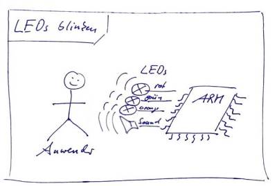 Die Aufgabe besteht darin in geeigneter Form das Konzept des System-Timers mit den daraus folgenden Systemereignissen zu demonstrieren. Als Rückmeldung für den Anwender benutzen wir optische Signale, das sind blinkende LEDs und ein akustisches Signal, das ist der Speaker.