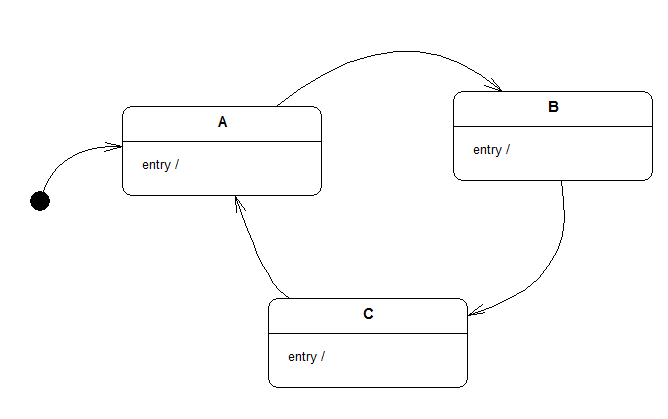 Sie erhalten dann die Grundstruktur für einen Zusatndsautomat mit drei Zuständen. Diese Vorlage passen wir an die Aufgabenstellung an. Benennen Sie die Zustände und die Zusatndsaktionen, wie in der folgenden Darstellung gezeigt, um.