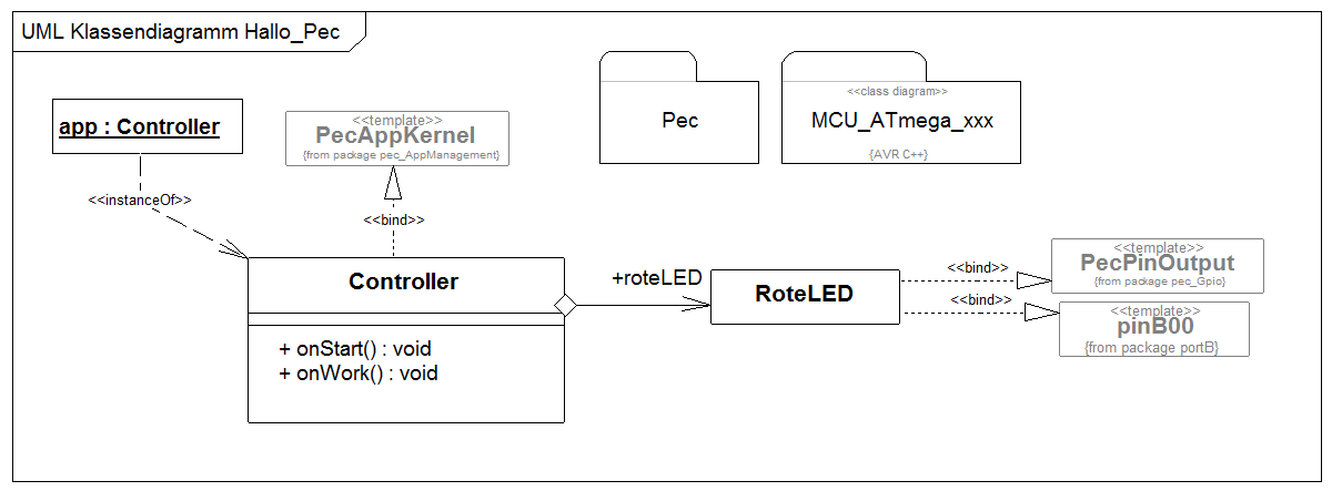 Diese Vorgehensweise für die Abbildung eines Systembausteins im Klassenmodell kann für die Arbeit mit den PEC-Bibliotheken durchaus als typisch angesehen werden. Zusätzlich wird diese Variante der Modellierung durch das Angebot zahlreicher PEC-Templates gefördert. Es liegt jetzt am Systemdesiner, dem Architekten in Ihnen eine geeignete Basisklasse oder ein geeignetes Template aus den Bibliotheken herauszusuchen. In der folgenden Darstellung wird die Realisierung mit dem Template PecPinOutput gezeigt. Dabei ist zu beachten, dass der Teil aus den eigentlichen PEC-Paketen lediglich festlegungen der Signatur der Klassen und Schnittstellen darstellt also portable und damit nicht spezifischen Code für AVR-Controller enthält. Diesen Umstand erkennen Sie am Präfix pec. Es ist notwendig zusätzlich controllerspezifische Informationen an die zu realisierende Klasse anzubinden. Das geschieht über die Zuweisung des betreffenden plattformspezifischen Pins.
