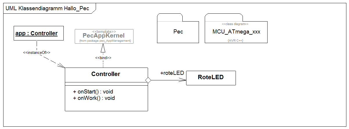 Die erste eigene Funktionalität die wir mit den Mitteln des PEC-Framework realisieren wollen ist, wie kann es anders sein, ein Blinky. Vorraussetzung ist, dass wir ein Projekt mit den PEC-Bibliotheken angelegt und ein Klassendiagramm mit dem Grundgerüst einer PEC-Anwendung erstellt haben.