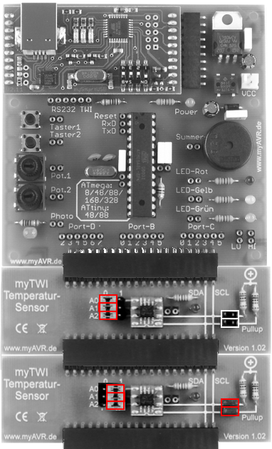 Als nächster Schritt soll ein weiterer Temperatursensor an den Bus angeschlossen werden. Dazu ist es nötig, diesem eine andere Adresse zuzuweisen. Beachten Sie auch, dass möglichst nur einmal die PullUp-Widerstände zugeschaltet sind.