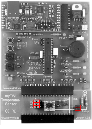 Beachten Sie, dass die Adress-Jumper alle auf „0“ stehen und damit die Standard-Basis-Adresse 0x90 für den LM75 verwendet wird. Sollten Sie weitere LM75 im Bus verwenden, müssen diese mit ihrer konkreten Adresse an den Bus angemeldet werden. Für die korrekte Funktion des I²C-Bus müssen die Busleitungen mit Pull-Up-Widerständen nach High gezogen werden.