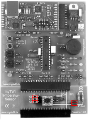 Die Beispielanwendung soll die aktuelle Temperatur vom Temperatursensor in Grad Celsius auslesen und per UART an den PC senden. Den Temperatursensor schließen wir als AddOn an das myAVR Board an.