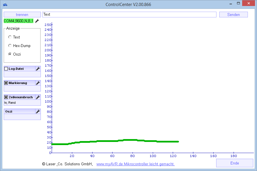 Zur Visualisierung sollte die Oszi-Ansicht des Controlcenters auf Punkte umgestellt werden. Tipp: Damit der zweite Sensor auch eine deutlich andere Temperatur hat, kann man diesen im Kühlschrank abkühlen