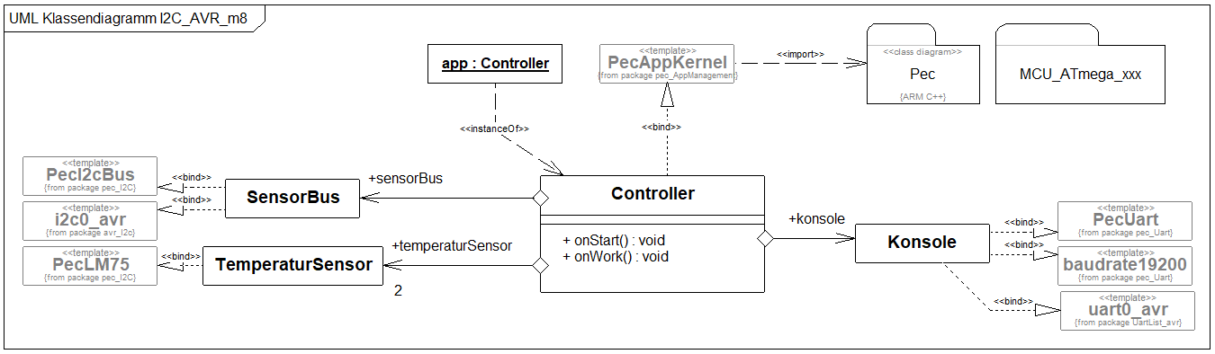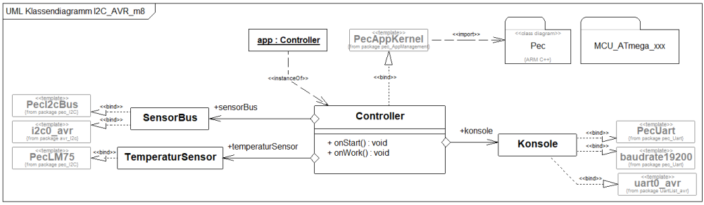 Bei Verwendung der I²C-Klassen wird in der PEC automatisch ein I²C-Bus instanziiert. Da es beim AVR auch immer nur einen TWI Baustein gibt, braucht sich der Anwendungsentwickler um nichts weiter zu kümmern, als sich eine Instanz der gewünschten Klasse zu erzeugen und diese zu benutzen.