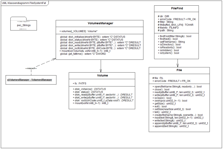 Des weiteren sollten externe Speichermedien mit einem Dateisystem versehen werden. Für die meisten Anwendungsfälle in eingebetteten Systemen mit 8-Bit Controllern reicht das gute alte FAT-Dateisystem absolut aus. Mit FAT16 können Speicherkarten mit bis zu 2GB verwalten. Auch für ein FAT-Dateisystem liegen entsprechende Treiberpaket und Klassen im PEC Framework vor.