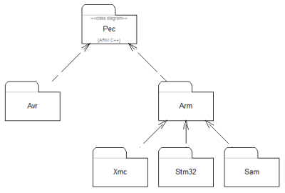 Auf der Basis der PEC-Bibliotheken werden plattformspezifische Realisierungen aufgebaut. Die hier gezeigte Version des PEC-Framework gliedert sich in die Realisierungen für 8 Bit AVR Controller und 32 Bit ARM Controller. Das ARM Paket enthält die für alle ARM gültigen Spezifikationen. Die ARM Controller werden wiederum in konkrete ARM-Familien aufgeteilt. Hier finden sich vor allem familienspezifische Realisierungen der herstellerabhängigen IP (internal peripherals). Möglich wird diese Portabilität durch die Verwendung von VariationPoints. Dabei stellt ein PEC-Interface (Klasse, Template oder Struktur) lediglich die abstrakte Definition zum Beispiel eines Bausteins ohne konkrete Realisierung dar.