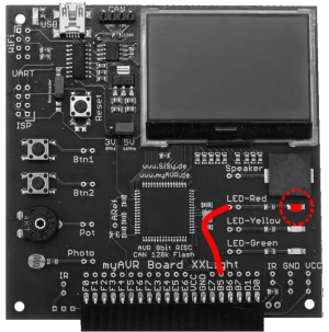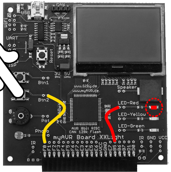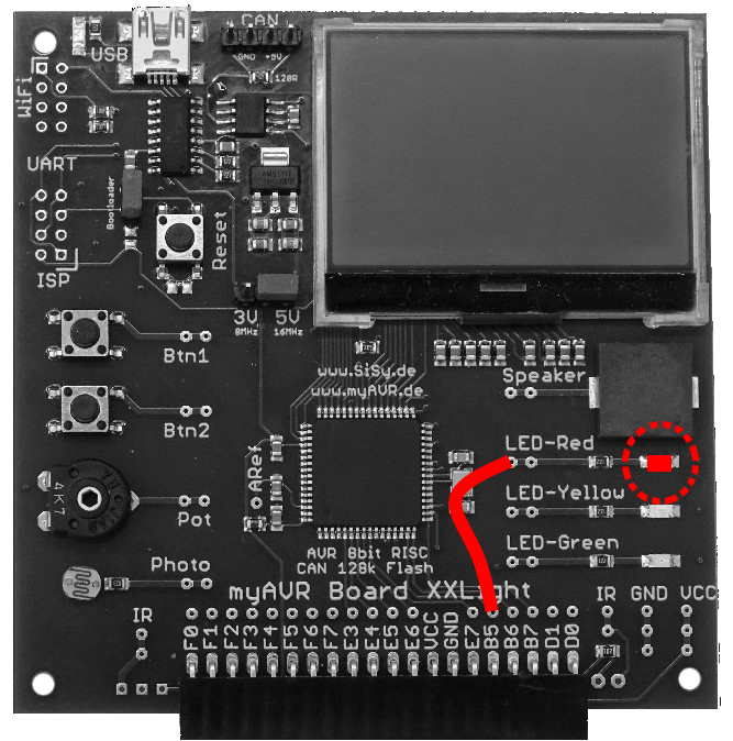 - die rote LED ist mit dem Controller über Port B Bit 0 verbunden