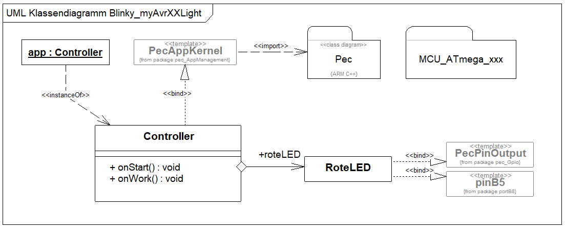 Die erste eigene Funktionalität die wir mit den Mitteln des PEC-Framework realisieren wollen ist, wie kann es anders sein, ein Blinky. Vorraussetzung ist, dass wir ein Projekt mit den PEC-Bibliotheken angelegt und ein Klassendiagramm mit dem Grundgerüst einer PEC-Anwendung erstellt haben.
