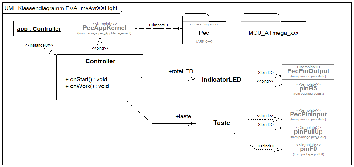 Diese Vorgehensweise für die Abbildung eines Systembausteins im Klassenmodell kann für die Arbeit mit den PEC-Bibliotheken durchaus als typisch angesehen werden. Zusätzlich wird diese Variante der Modellierung durch das Angebot zahlreicher PEC-Templates gefördert. Es liegt jetzt am Systemdesiner, dem Architekten in Ihnen eine geeignete Basisklasse oder ein geeignetes Template aus den Bibliotheken herauszusuchen. In der folgenden Darstellung wird die Realisierung mit dem Template PecPinOutput gezeigt. Dabei ist zu beachten, dass der Teil aus den eigentlichen PEC-Paketen lediglich festlegungen der Signatur der Klassen und Schnittstellen darstellt also portable und damit nicht spezifischen Code für AVR-Controller enthält. Diesen Umstand erkennen Sie am Präfix pec. Es ist notwendig zusätzlich controllerspezifische Informationen an die zu realisierende Klasse anzubinden. Das geschieht über die Zuweisung des betreffenden plattformspezifischen Pins.