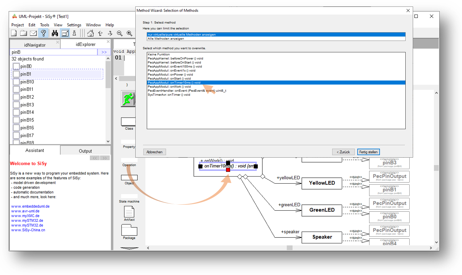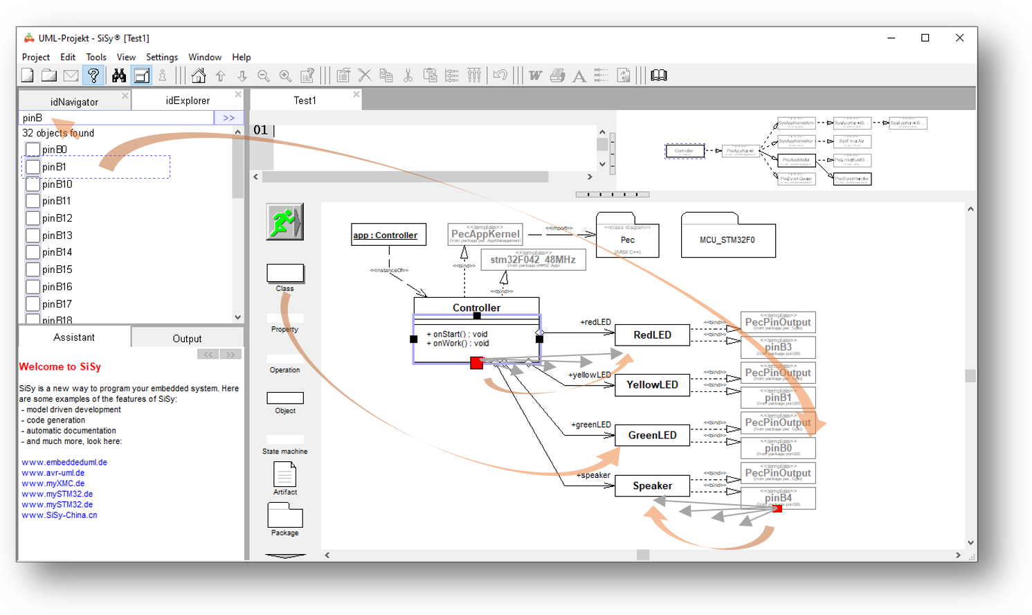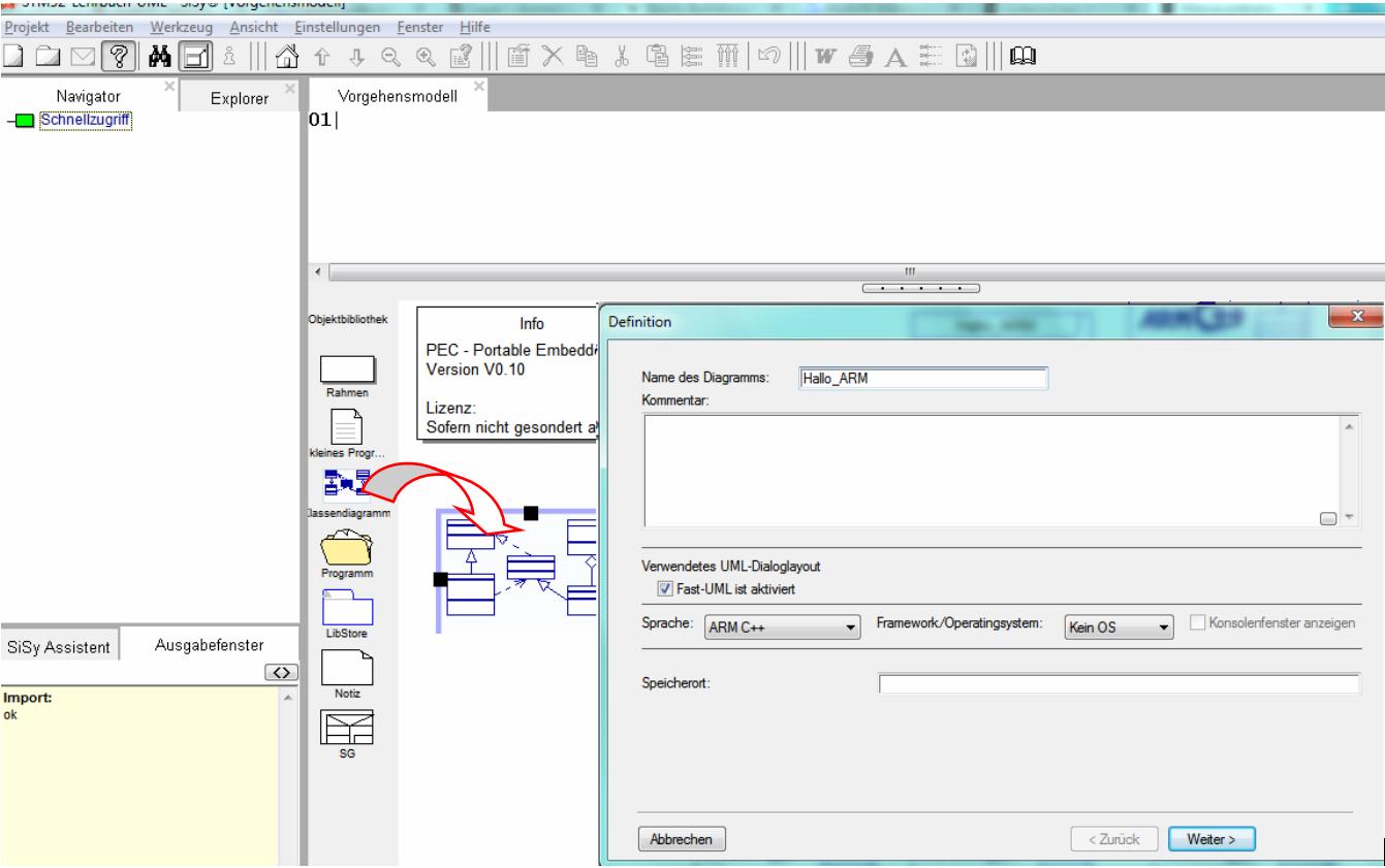 - gewünschte Klasse LED im Navigator/Explorer suchen und ins Diagramm ziehen