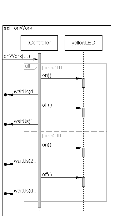Controller::onWork():voidstatic uint16_t dim=0; if (dim < 1000) { yellowLED.on(); waitUs(dim); yellowLED.off(); waitUs(1000-dim); dim++; } else if (dim <2000) { yellowLED.on(); waitUs(2000-dim); yellowLED.off(); waitUs(dim-1000); dim++; } else { dim=0; }