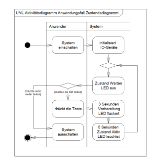 Das folgende Zustandsdiagramm zeigt welchen Zustand und welche Zustandswechsel ein Objekt mindestens hat, auch ohne eine explizit realisierte Zustandsmaschine.