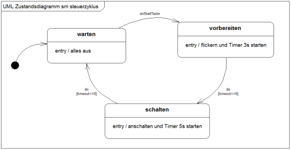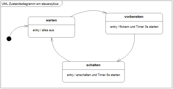 Das konkrete, den Zuständen zuzuordnende Verhalten notieren wir in den Zustandsaktionen. Für die Aufgabenstellung reichen uns die Entry-Aktionen der Zustände. Ergänzen Sie diese wie folgt: