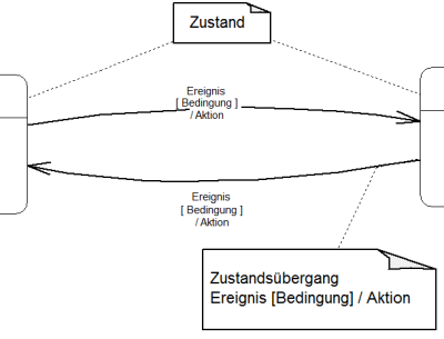 Der Übergang von einem Zustand in den anderen bedeutet in jedem Fall Verhalten. Es passiert also etwas und der Übergang verbraucht auch Zeit. Es wird konkretes Verhalten ausgeführt und damit finden wir die Zustandsübergänge im Programmcode als eine entsprechende Codesequenz. Die Zustandsübergänge können durch Ereignisse und Bedingungen ausgelöst werden. Das Ereignis spezifiziert wann der Übergang stattfindet. Letztlich ist ein Ereignis im Quellcode eine Operation der Klasse des Objektes. In eingebetteten Systemen kann das auch eine dem Objekt zugeordnete Interrupserviceroutine (ISR) sein. Bedingungen (Guards) drücken aus unter welchen Konditionen ein Übergang zulässig ist. Die Notation von Zustandsübergängen erfolgt durch eine gerichtet Linie (Pfeil) mit Beschriftung (Ereignis [Bedingung] / Aktion).