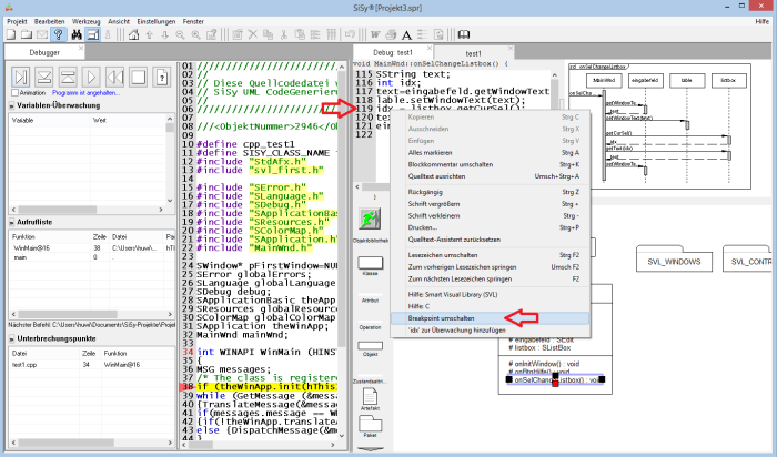 Der Debugger hält die Anwendung an bevor die Zeile mit dem Unterbrechungspunkt abgearbeitet werden soll. Jetzt können Variablen in die Beobachtungsansicht des Debuggers aufgenommen und die Anwendung im Schrittbetrieb untersucht werden. Der Quelltext und das Modell werden den Debuggerschritten nachgeführt.