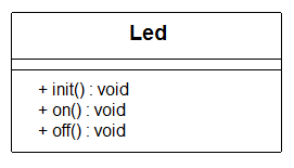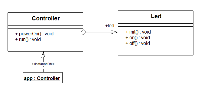 - Die Klasse DigitalOut wird unter dem Namen led in der Klasse Controller als öffentliches Attribut aggregiert.